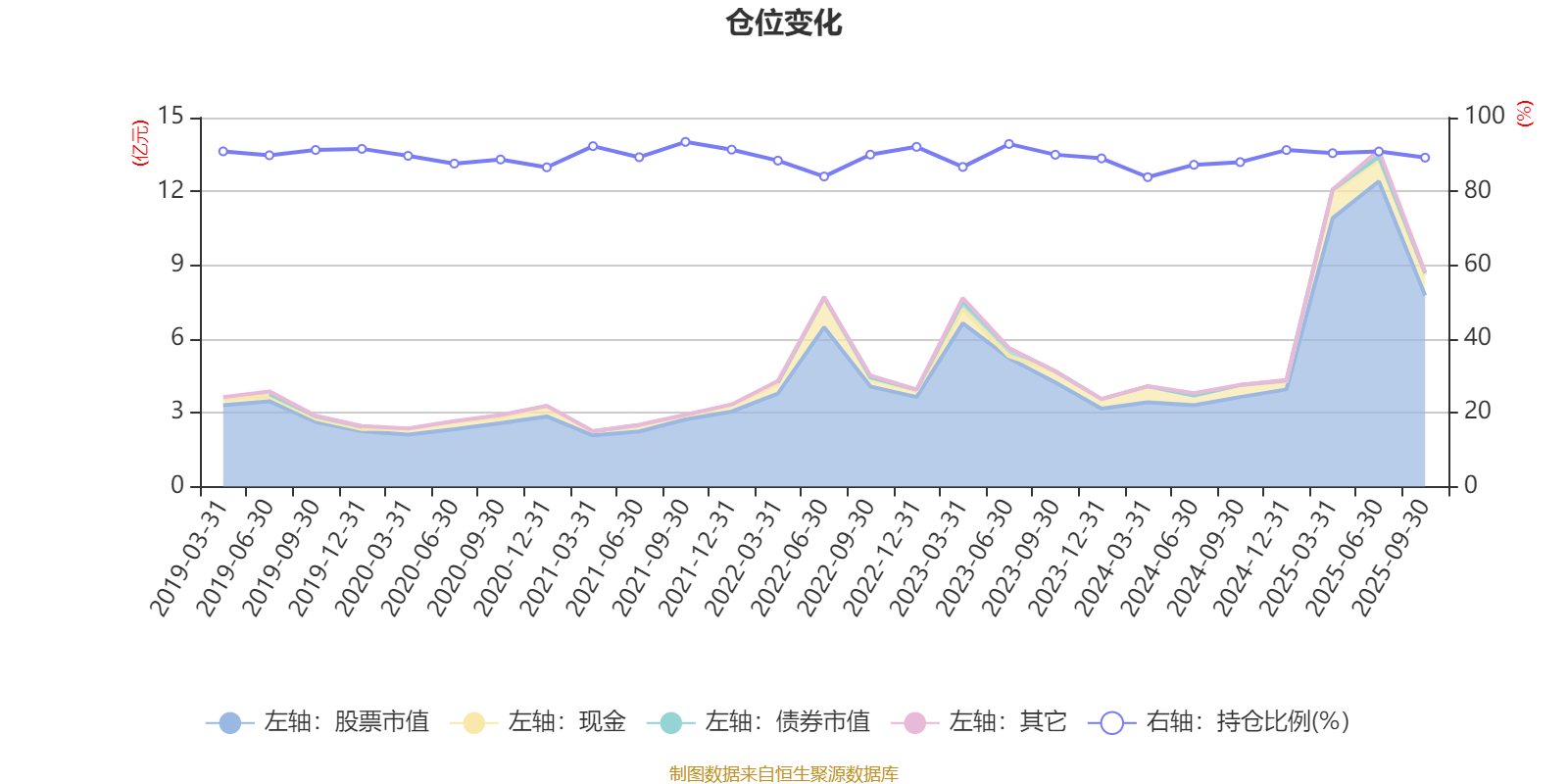 据定期报告数据统计,近三年平均股票仓位为89.25%,同类平均为72.35%。2021年三季度末基金达到93.42%的最高仓位,2024年一季度末最低,为83.86%。