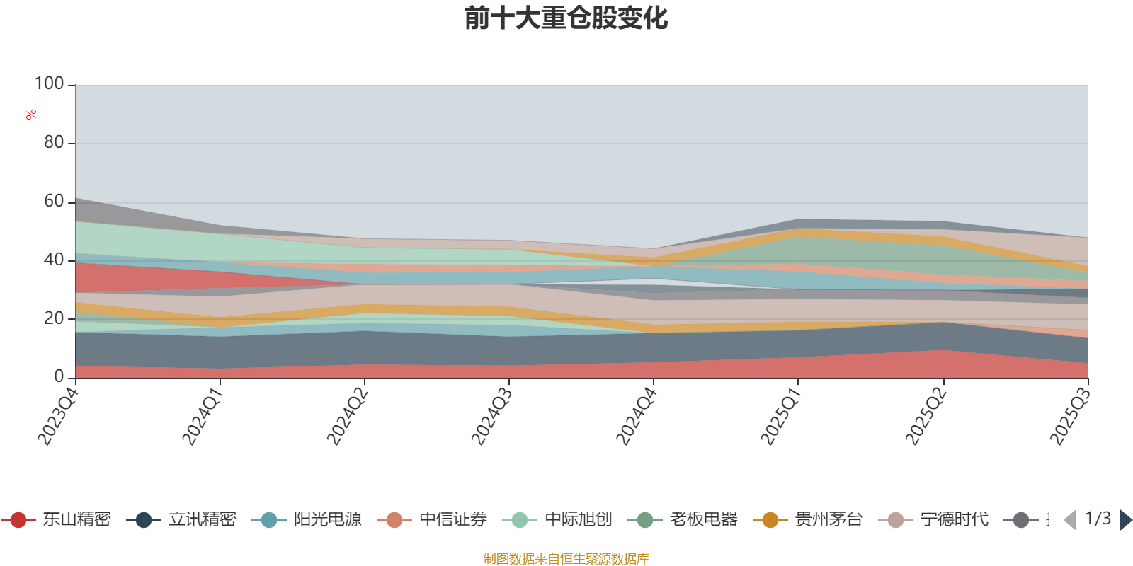 截至2025年三季度末,基金十大重仓股分别是亿纬锂能、宁德时代、立讯精密、东山精密、徐工机械、胜宏科技、牧原股份、中信证券、招商银行、中国平安。