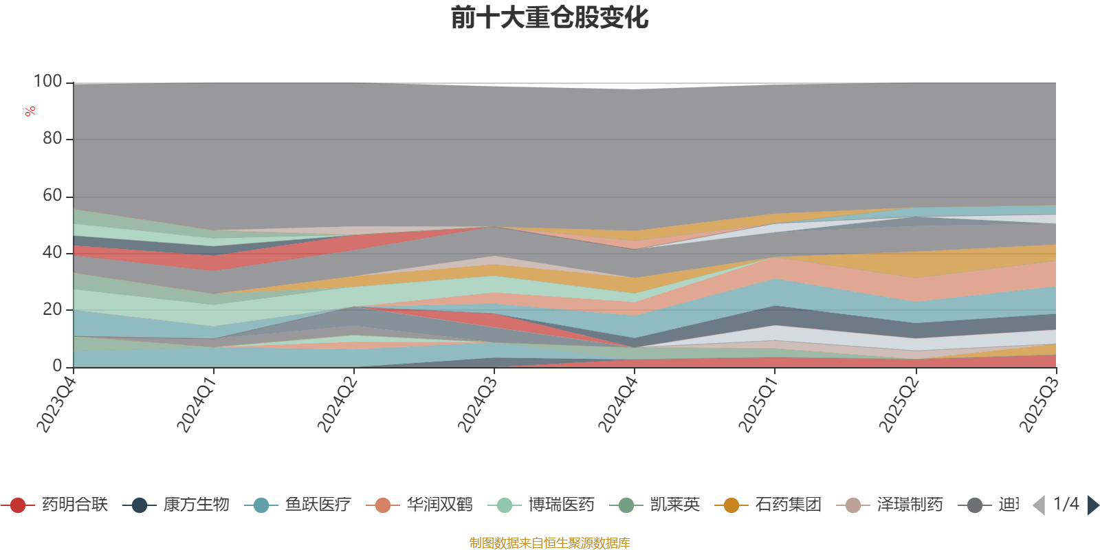 截至2025年三季度末,基金十大重仓股分别是药明康德、科伦博泰生物-B、恒瑞医药、信达生物、百济神州、三生制药、药明合联、石药集团、中国生物制药、海思科。