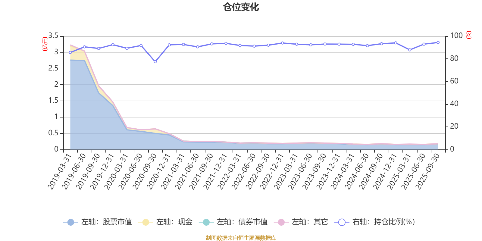 据定期报告数据统计,近三年平均股票仓位为92.7%,同类平均为72.35%。2025年三季度末基金达到94.44%的最高仓位,2020年三季度末最低,为77.44%。