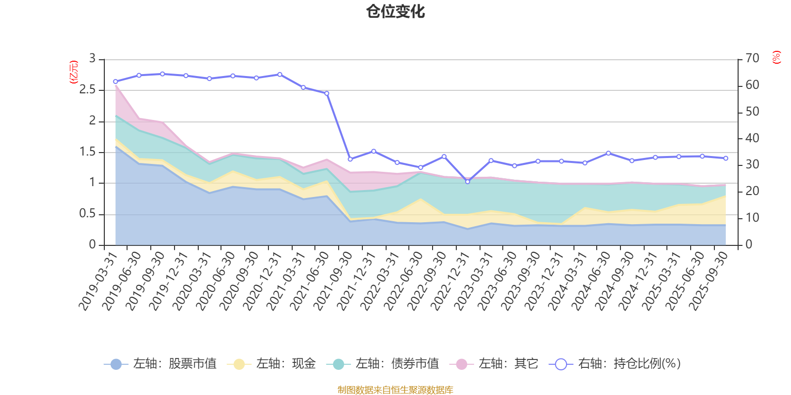 据定期报告数据统计,近三年平均股票仓位为31.57%,同类平均为19.14%。2019年三季度末基金达到64.47%的最高仓位,2022年末最低,为23.88%。