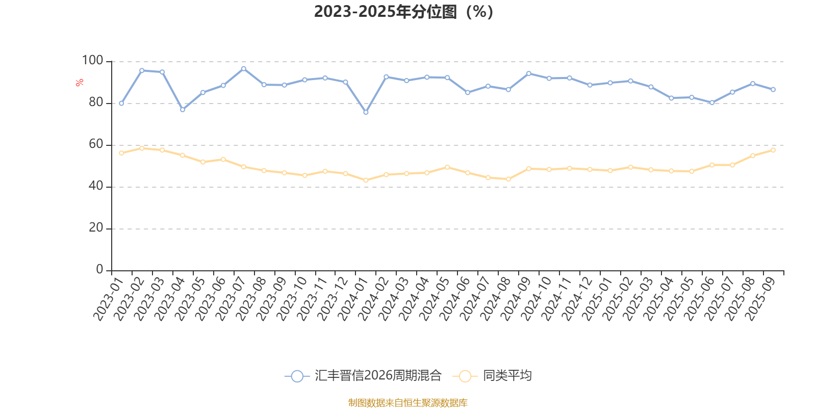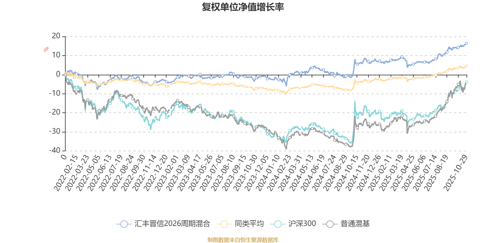 截至10月29日,汇丰晋信2026周期混合近三个月复权单位净值增长率为5.21%,位于同类可比基金108/629;近半年复权单位净值增长率为10.31%,位于同类可比基金94/629;近一年复权单位净值增长率为9.77%,位于同类可比基金183/623;近三年复权单位净值增长率为23.80%,位于同类可比基金47/557。