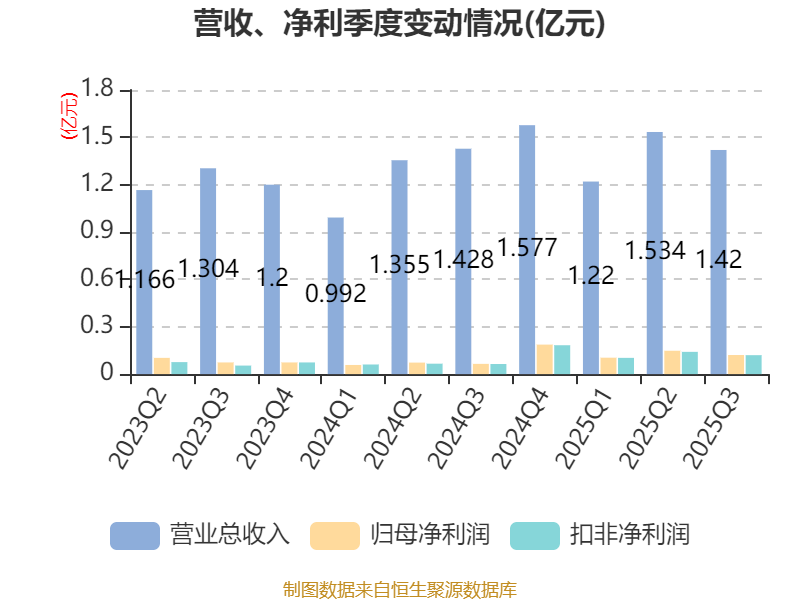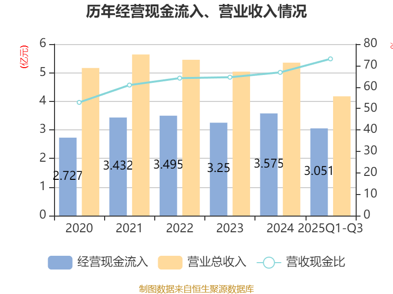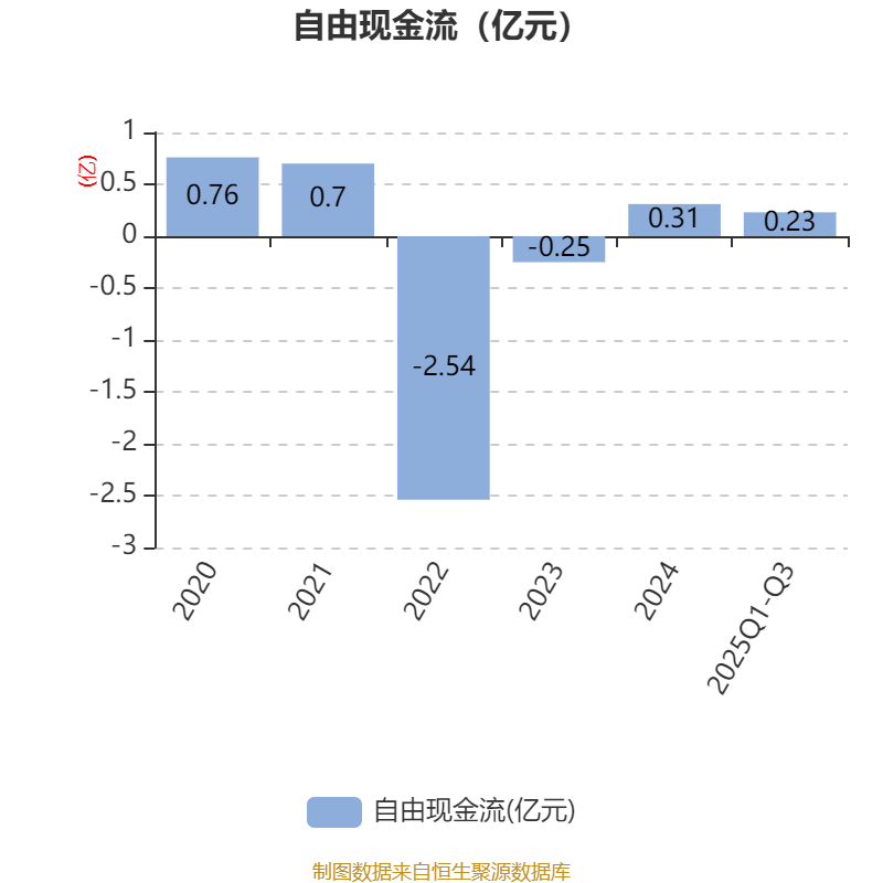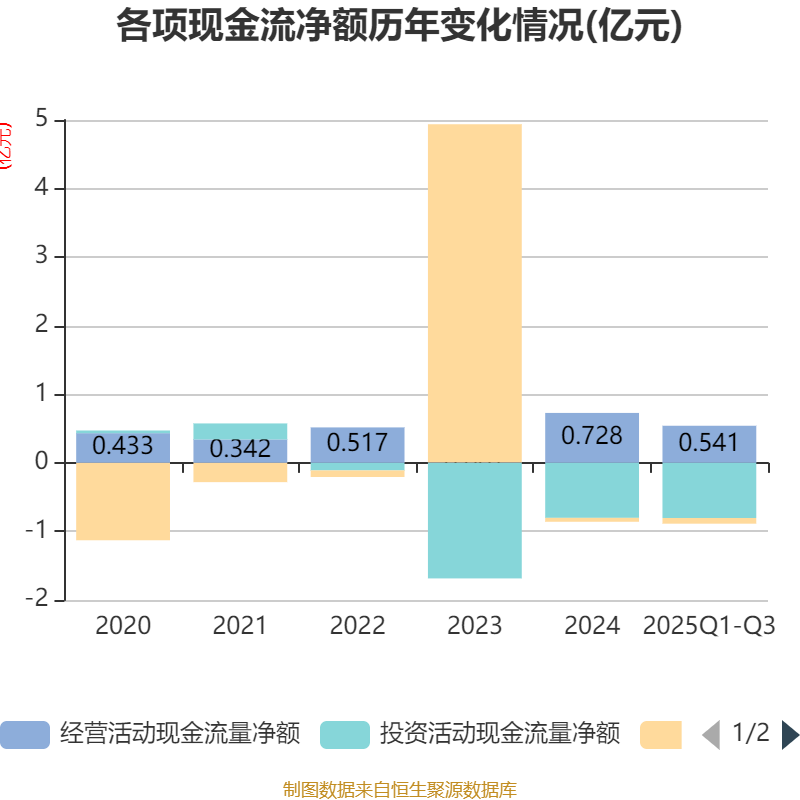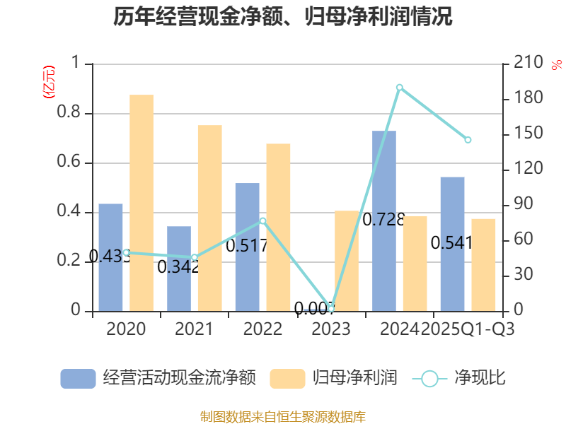 2025年前三季度,公司经营活动现金流净额为5409.72万元,同比增长56.14%;筹资活动现金流净额-825.3万元,同比减少683.9万元;投资活动现金流净额-8042.5万元,上年同期为-7179.27万元。