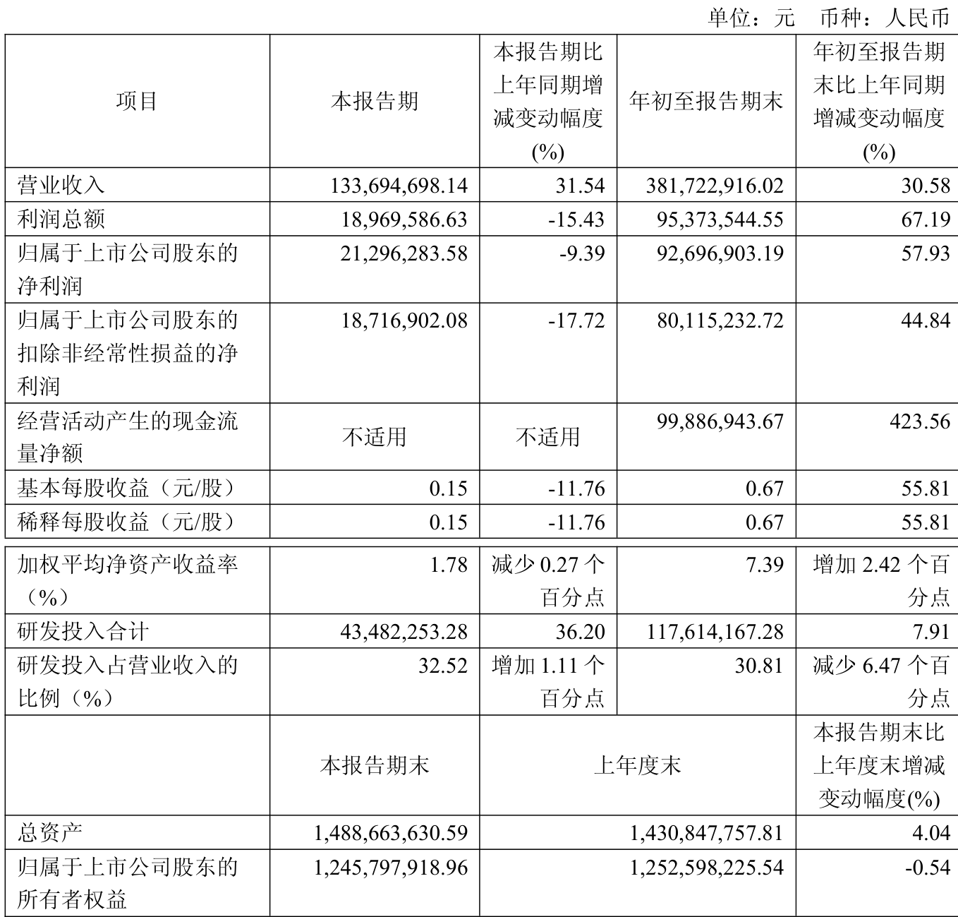 中证智能财讯佰仁医疗(688198)10月31日披露2025年第三季度报告。前三季度公司实现营业总收入3.82亿元,同比增长30.58%;归母净利润9269.69万元,同比增长57.93%;扣非净利润8011.52万元,同比增长44.84%;经营活动产生的现金流量净额为9988.69万元,同比增长423.56%;报告期内,佰仁医疗基本每股收益为0.67元,加权平均净资产收益率为7.39%。