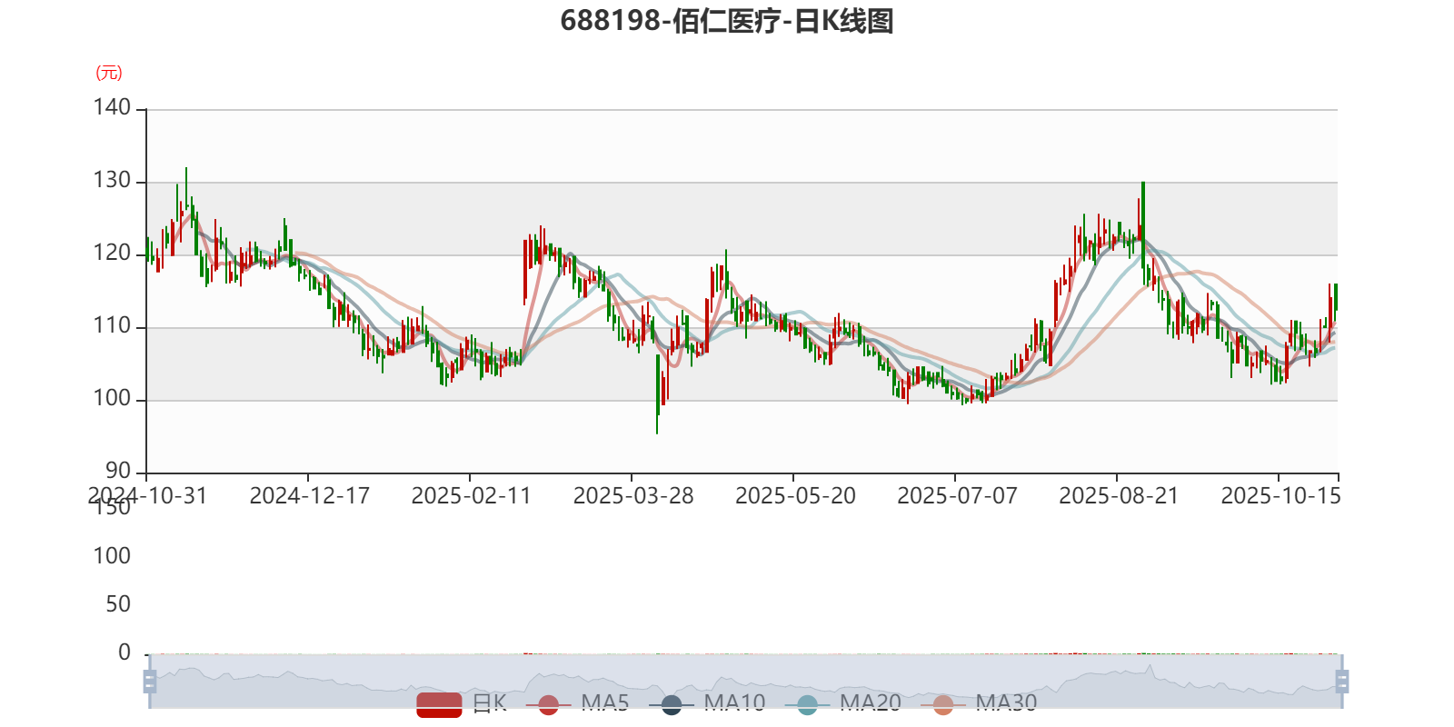 以10月30日收盘价计算,佰仁医疗目前市盈率(TTM)约为85.86倍,市净率(LF)约12.43倍,市销率(TTM)约26.19倍。