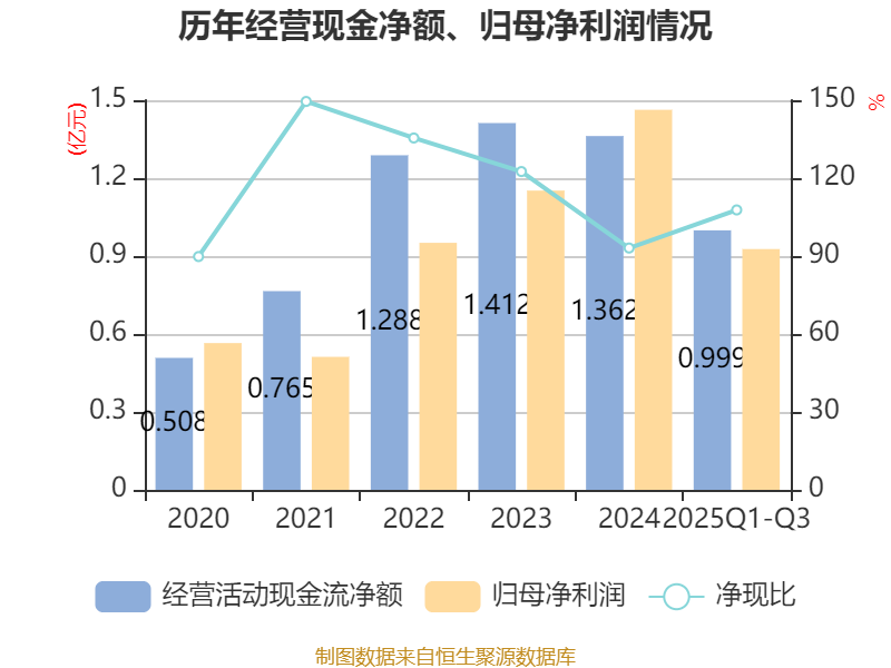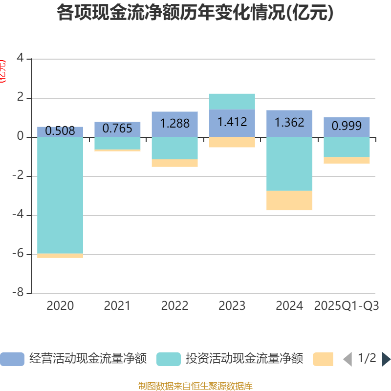 2025年前三季度,公司经营活动现金流净额为9988.69万元,同比增长423.56%;筹资活动现金流净额-3305.93万元,同比增加6598.26万元;投资活动现金流净额-1.04亿元,上年同期为-7528.72万元。