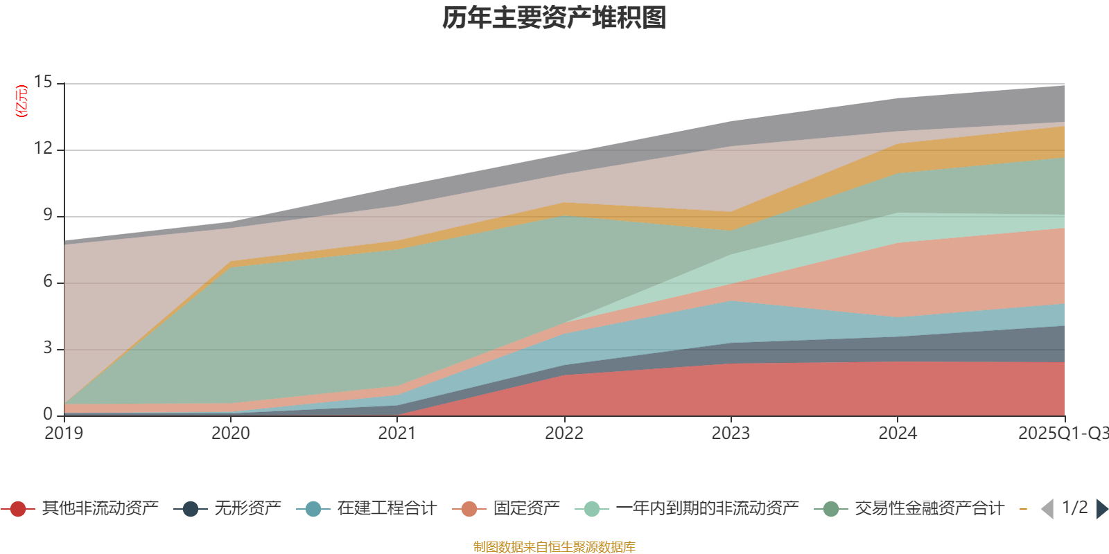 资产重大变化方面,截至2025年三季度末,公司一年内到期的非流动资产较上年末减少55.83%,占公司总资产比重下降5.46个百分点;交易性金融资产合计较上年末增加44.95%,占公司总资产比重上升4.9个百分点;无形资产较上年末增加46.84%,占公司总资产比重上升3.23个百分点;货币资金较上年末减少65.93%,占公司总资产比重下降2.63个百分点。