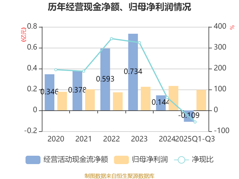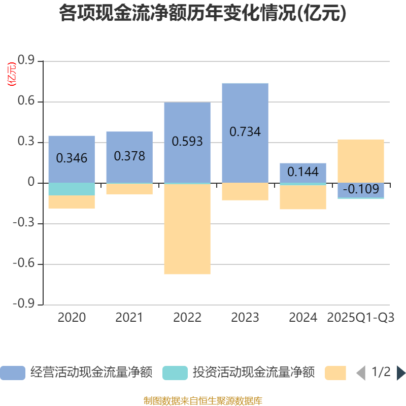 2025年前三季度,公司经营活动现金流净额为-1087.94万元,同比增加2396.75万元;筹资活动现金流净额3193.26万元,同比增加4953.06万元;投资活动现金流净额-101.07万元,上年同期为-5200.83万元。
