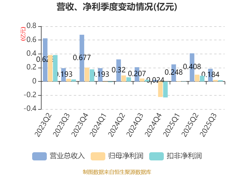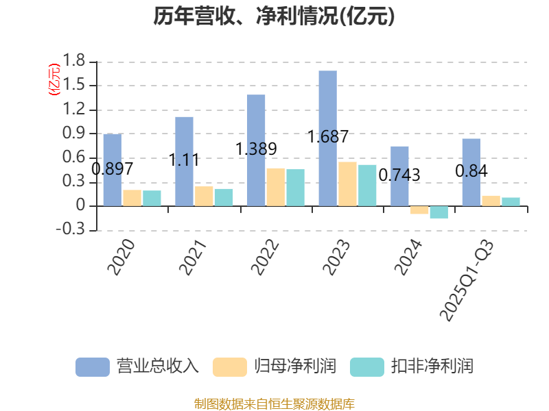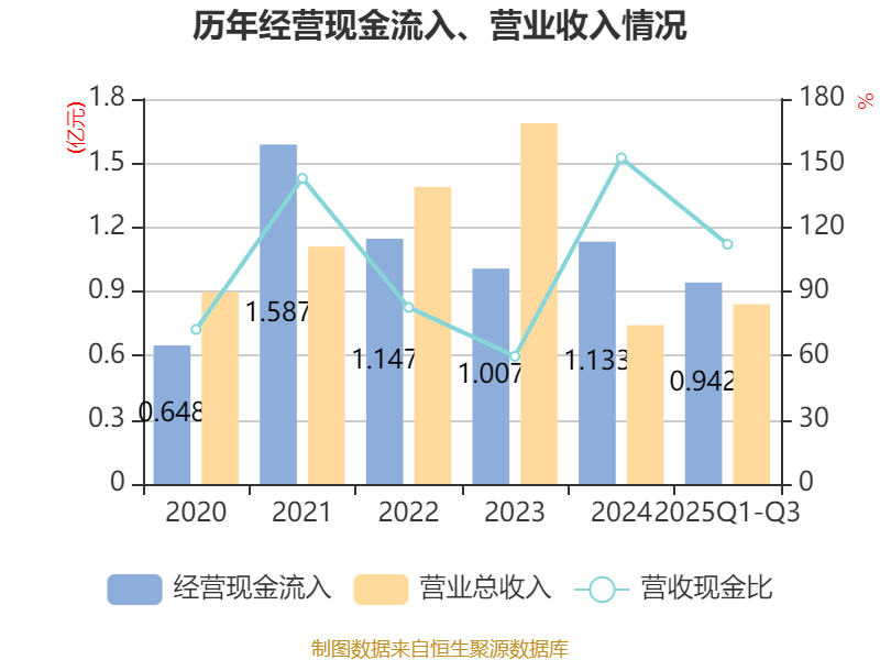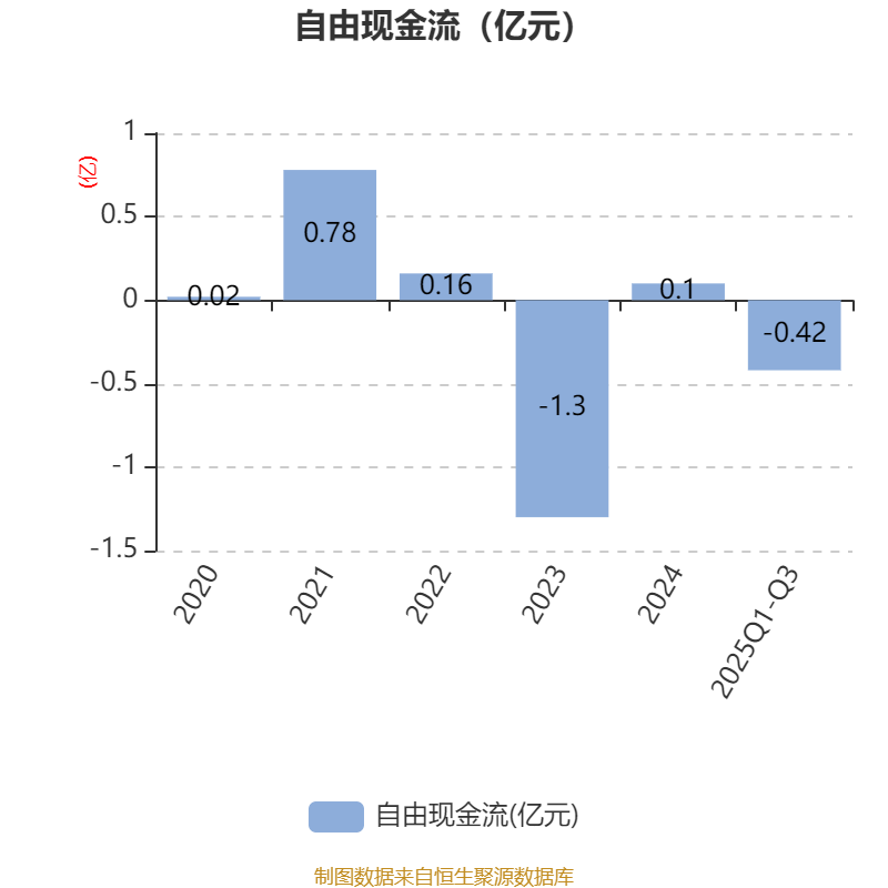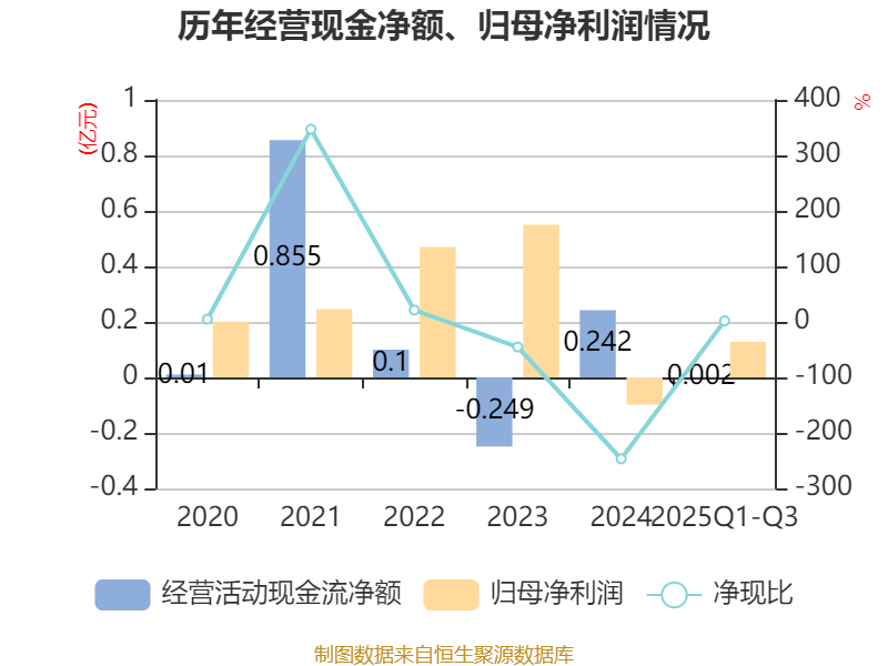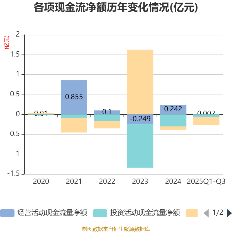 2025年前三季度,公司经营活动现金流净额为23.4万元,同比下降68.79%;筹资活动现金流净额-1891.42万元,同比减少153.78万元;投资活动现金流净额-743.79万元,上年同期为-867.36万元。