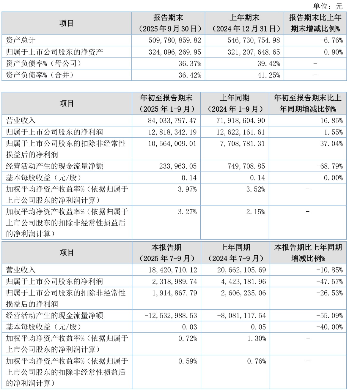 (原标题:晟楠科技:2025年前三季度净利润1281.83万元 同比增长1.55%)