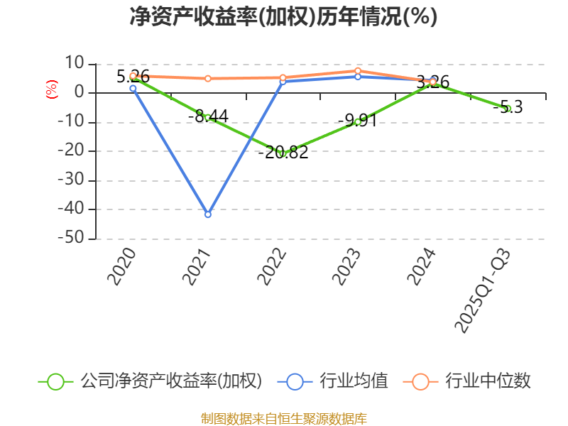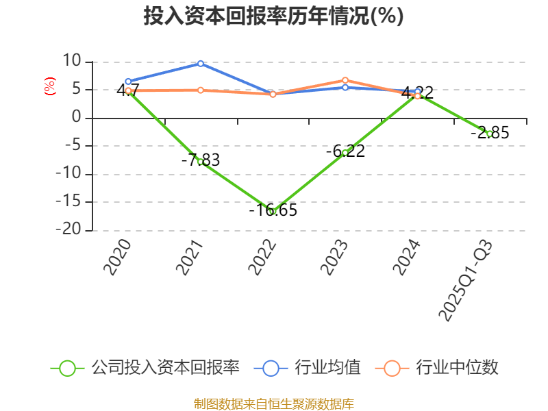 盈利能力方面, 2025年前三季度公司加权平均净资产收益率为-5.3%,同比下降7.29个百分点。公司2025年前三季度投入资本回报率为-2.85%,较上年同期下降5.18个百分点。