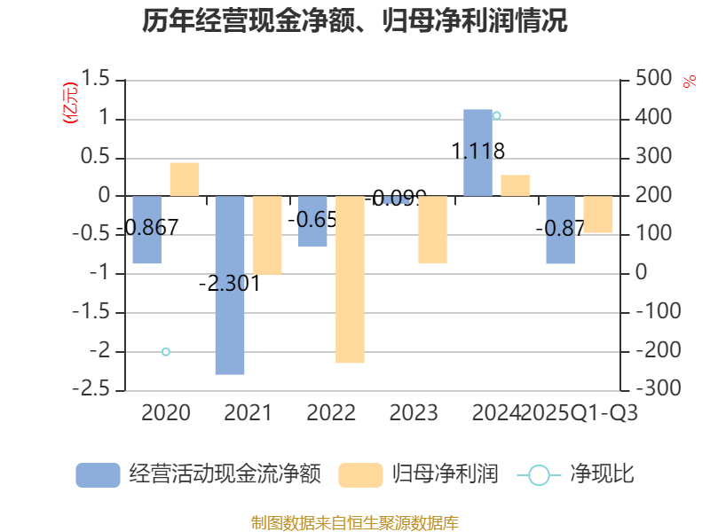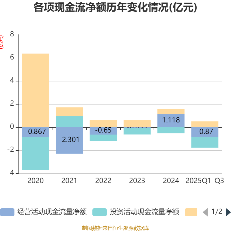 2025年前三季度,公司经营活动现金流净额为-8700.27万元,同比减少4820.12万元;筹资活动现金流净额4930.63万元,同比增加7265.34万元;投资活动现金流净额-9204.69万元,上年同期为-4648.15万元。