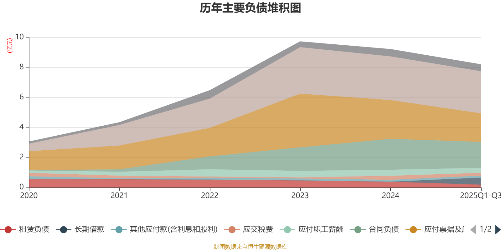 负债重大变化方面,截至2025年三季度末,公司应付票据及应付账款较上年末减少26.43%,占公司总资产比重下降2.93个百分点;长期借款占公司总资产的2.54%,上年末为0;合同负债较上年末减少16.31%,占公司总资产比重下降1.2个百分点;租赁负债较上年末减少50.67%,占公司总资产比重下降0.94个百分点。