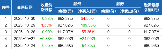 融资方面,当日融资买入208.41万元,融资偿还143.86万元,融资净买入64.55万元。融券方面,融券卖出0份,融券偿还0份,融券余量0份,融券余额0元。融资融券余额合计992.37万元。