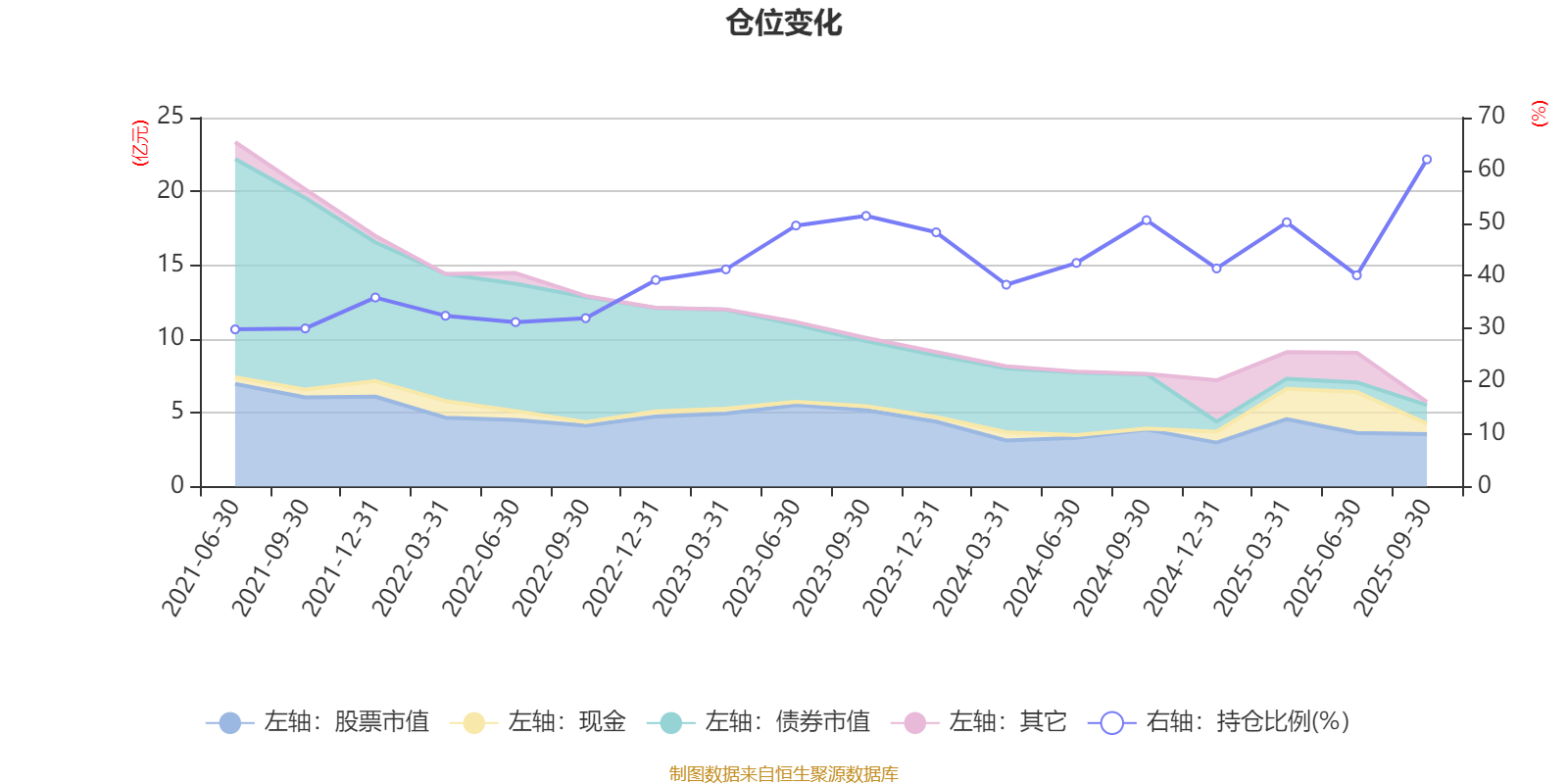 据定期报告数据统计,近三年平均股票仓位为46.2%,同类平均为67.37%。2025年三季度末基金达到62.07%的最高仓位,2021年上半年末最低,为29.82%。
