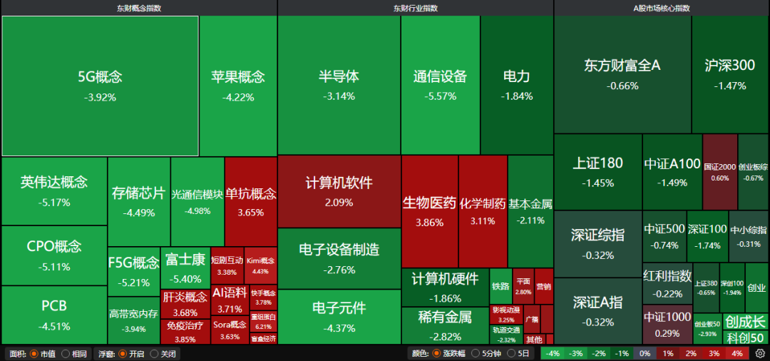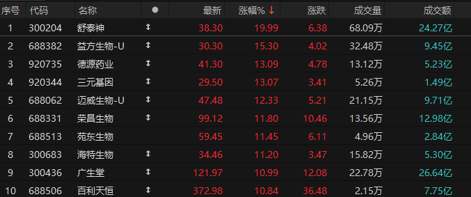 A股三大指数昨日集体回调,沪指跌0.81%,收报3954.79点;深证成指跌1.14%,收报13378.21点;创业板指跌2.31%,收报3187.53点。沪深两市成交额达到23178亿,较上一日缩量1039亿。行业板块涨多跌少,生物制品、化学制药、文化传媒、互联网服务、医疗服务、软件开发板块涨幅居前,保险、小金属、半导体板块跌幅居前。