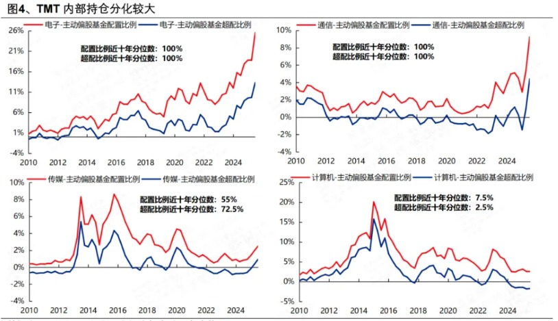 当前TMT内部持仓分化本身也较大,后续可以通过内部“再平衡”的方式消化板块整体的配置比例。以计算机和传媒为代表的AI中下游产业链,25Q3主动公募配置比例仍处于近十年中低分位数水平。随着后续AI产业趋势向中下游应用端扩散,或可以通过内部“再平衡”的方式来消化板块整体的配置比例。