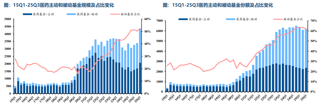 从基金份额来看,25Q3医药基金总份额为6191亿份,环比+1.4%,其中医药主动基金为2352亿份,环比+4.8%,七个季度环比增速首次回正,占比38%,医药被动基金为3838亿份,环比-0.5%,占比62%,被动基金占比环比下降1.2pct。从18Q1到25Q3,医药被动基金占比从21%提升至62%,占比快速提升。