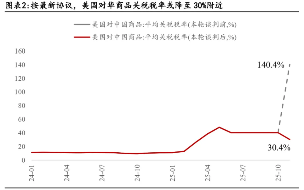 1)关税税率下降且暂停一年,外需冲击的影响边际减弱:与10月初理论上超140%的关税税率相比,本轮谈判后美国对中国税率降至30%附近,尽管仍高于其对全球平均税率(17%-18%),但影响边际减弱,且暂停期一年,一定程度消除贸易层面担忧,但鉴于特朗普政策多变,后续仍需继续关注;(2)从估值和两融看A股风险水平仍在合理范围,而支持A股向上逻辑并未变化:一是在新一轮科技革命和产业变革中,中国诞生了一大批具有国际竞争力的优质企业。二是当前处在本轮盈利下行尾声筑底期,后续上市公司盈利有望系统性回升。三是国内利率水平处于历史低位,权益资产性价比突出。四是国家出台一系列重要政策支持资本市场高质量发展。
