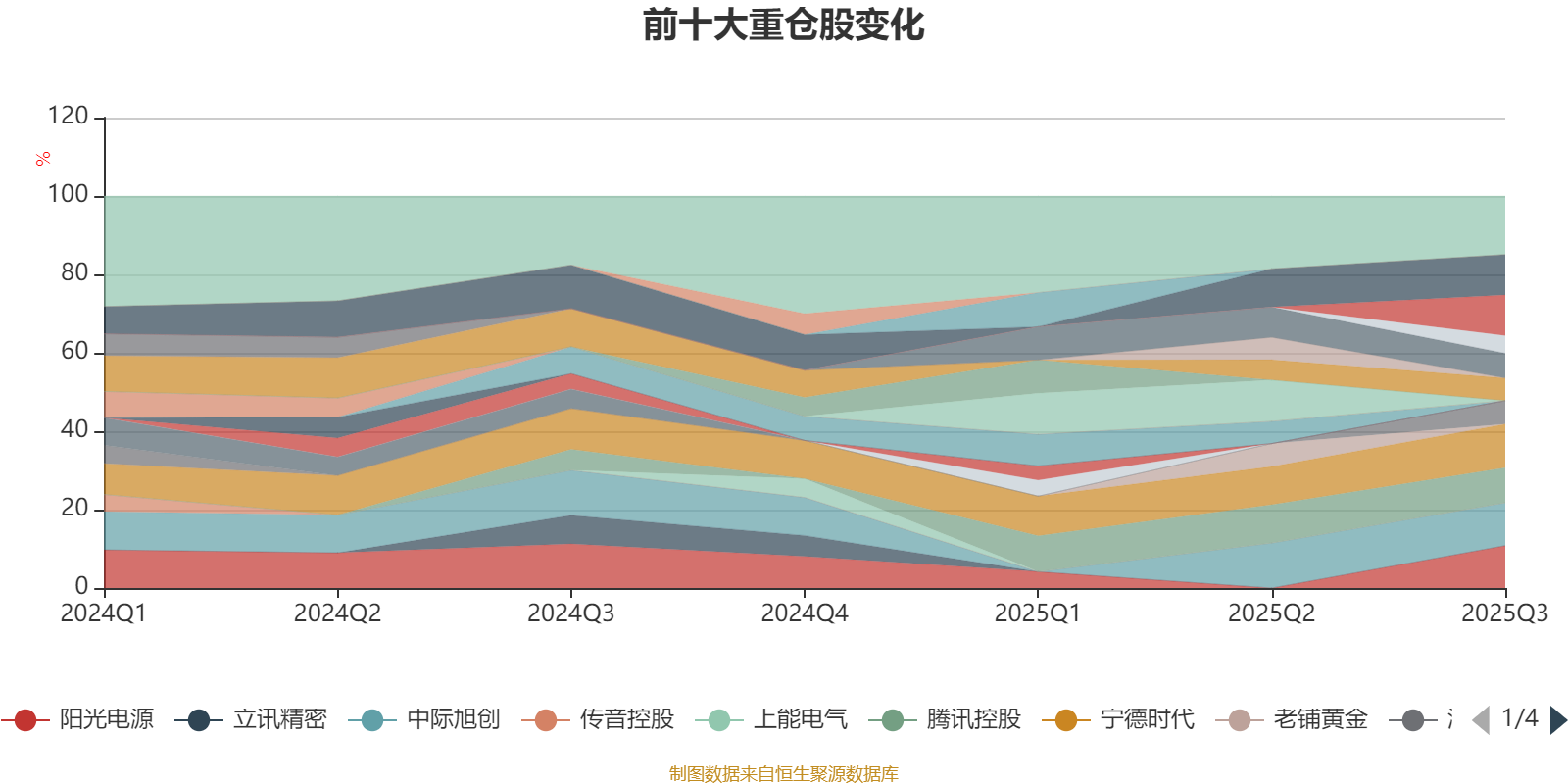 该基金持股集中度较高。截至2025年三季度末,基金十大重仓股分别是宁德时代、中际旭创、阳光电源、工业富联、新易盛、腾讯控股、阿里巴巴-W、深南电路、沪电股份、亿纬锂能。