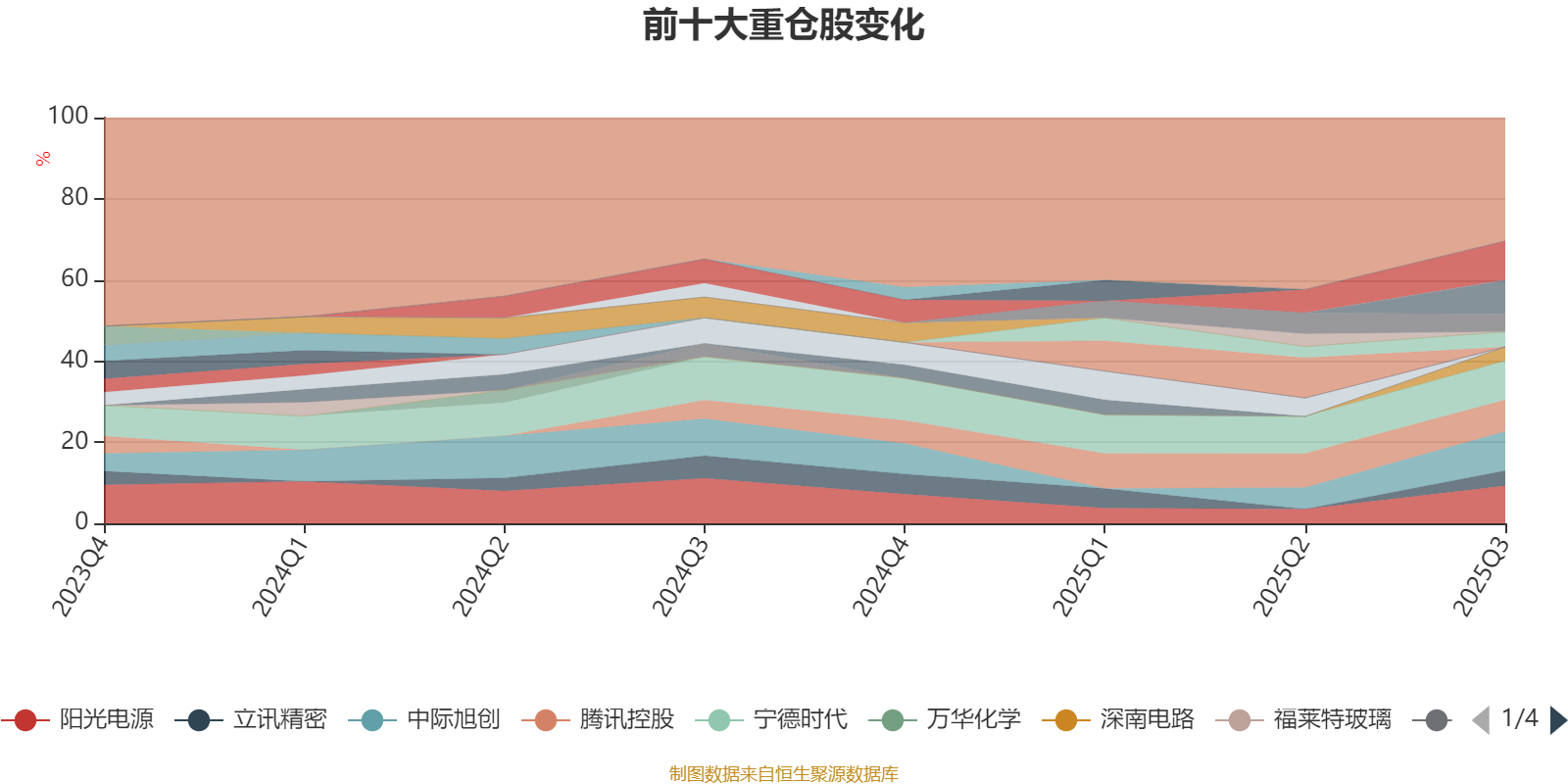 截至2025年三季度末,基金十大重仓股分别是中际旭创、新易盛、宁德时代、阳光电源、工业富联、腾讯控股、阿里巴巴-W、立讯精密、中芯国际、深南电路。