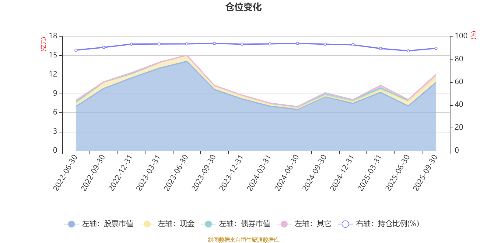 据定期报告数据统计,近三年平均股票仓位为92.27%,同类平均为87.09%。2024年上半年末基金达到93.89%的最高仓位,2025年上半年末最低,为87.43%。