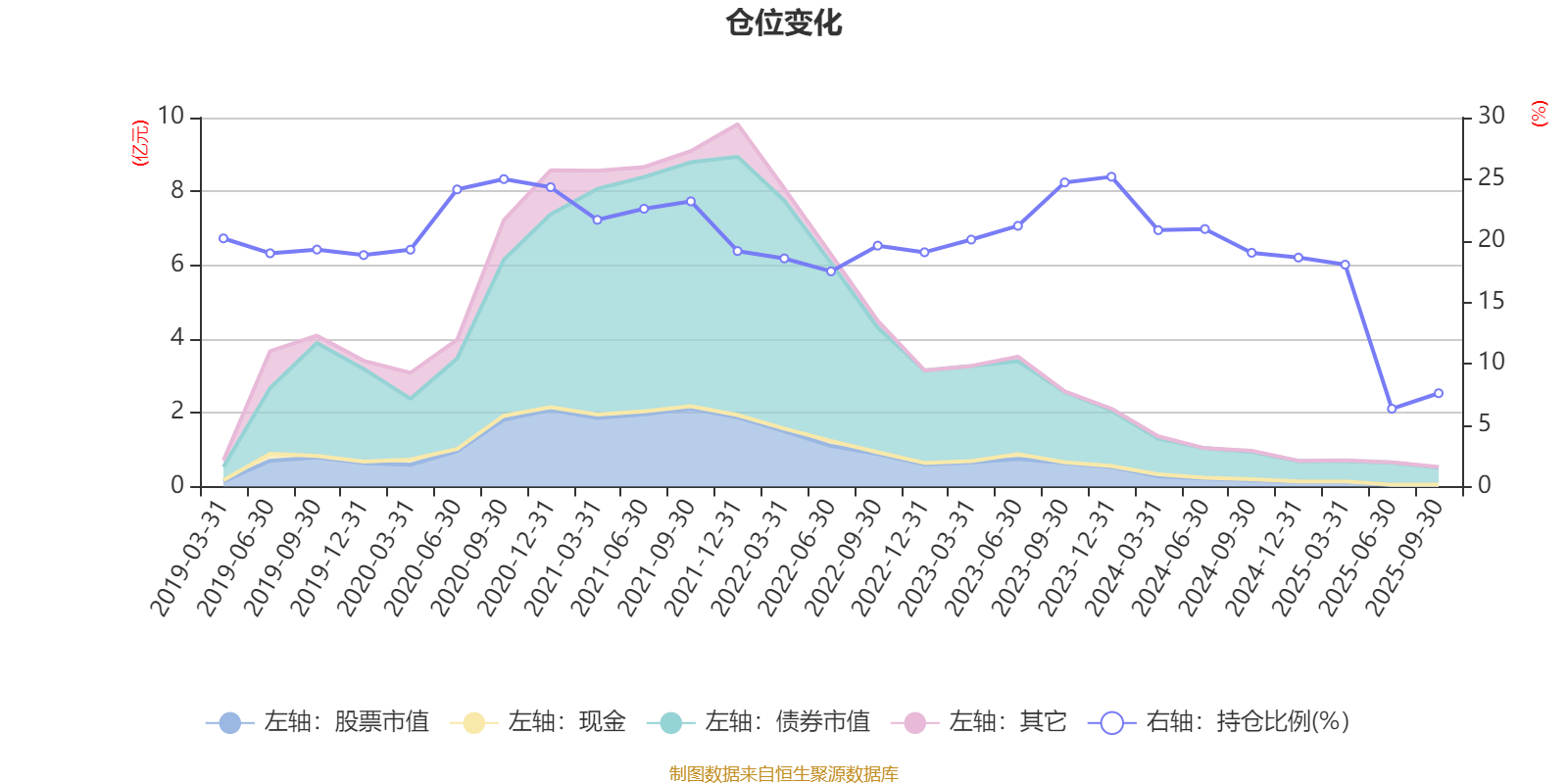 据定期报告数据统计,近三年平均股票仓位为18.47%,同类平均为19.14%。2023年末基金达到25.19%的最高仓位,2025年上半年末最低,为6.33%。