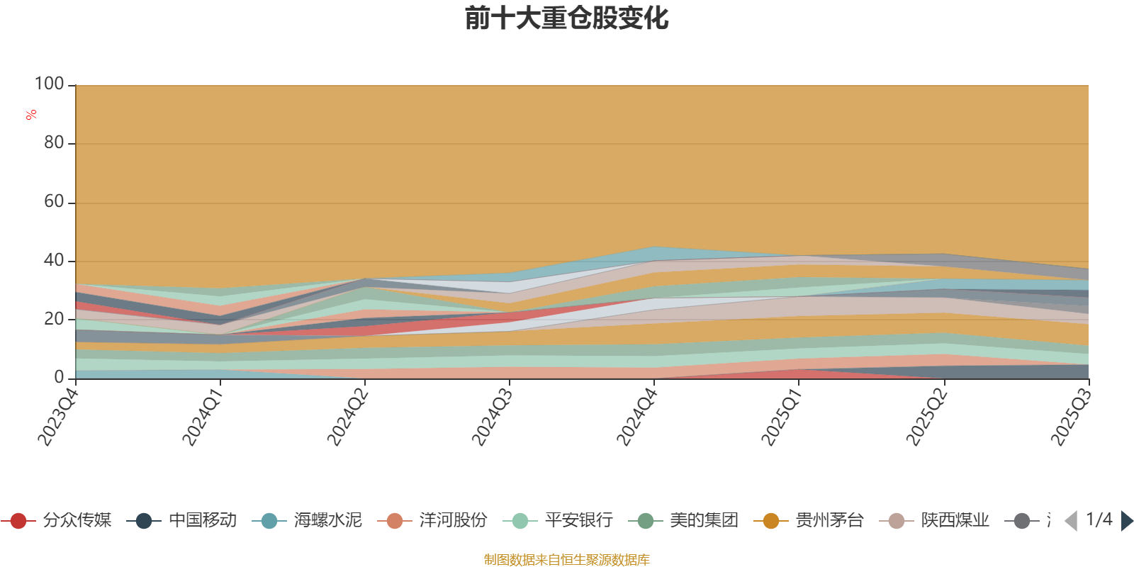 截至2025年三季度末,基金十大重仓股分别是贵州茅台、中国移动、海尔智家、平安银行、陕西煤业、万华化学、美的集团、宁德时代、海康威视、中兴通讯。