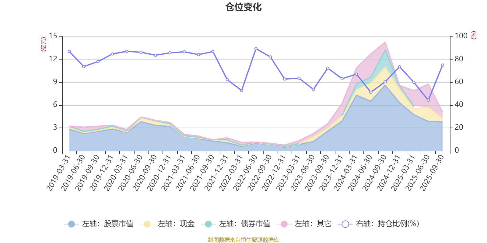 据定期报告数据统计,近三年平均股票仓位为62.22%,同类平均为85.99%。2022年上半年末基金达到89.3%的最高仓位,2025年上半年末最低,为44.19%。