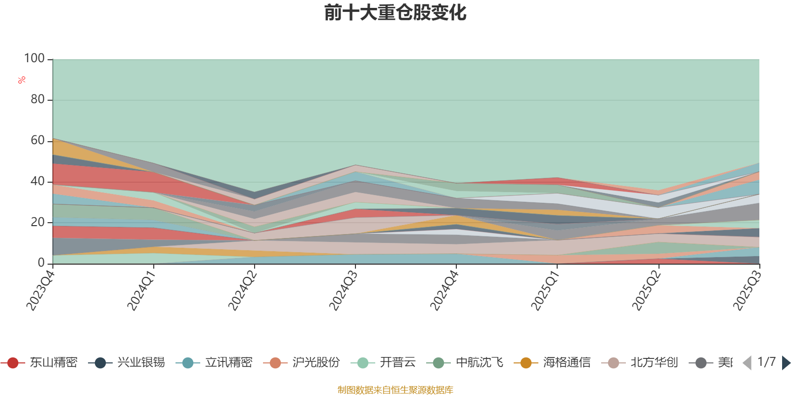 截至2025年三季度末,基金十大重仓股分别是药明康德、恒瑞医药、北方华创、立讯精密、寒武纪、昭衍新药、宁德时代、盛达资源、恺英网络、兴业银锡。