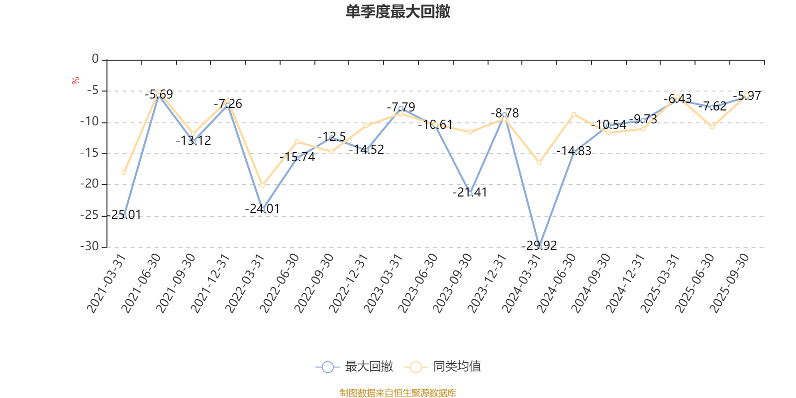 截至10月28日,基金近三年最大回撤为54.85%,同类可比基金排名500/513。单季度最大回撤出现在2024年一季度,为29.92%。