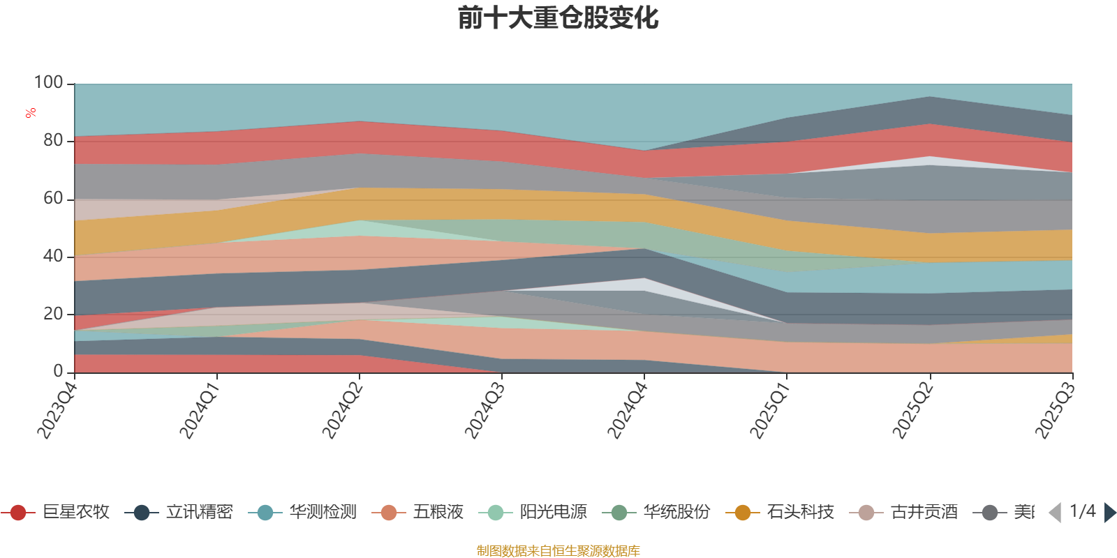 该基金持股集中度较高,近2年前十大重仓股集中度长期超过60%。截至2025年三季度末,基金十大重仓股分别是泸州老窖、山西汾酒、牧原股份、贵州茅台、五粮液、百润股份、今世缘、锦波生物、美的集团、石头科技。