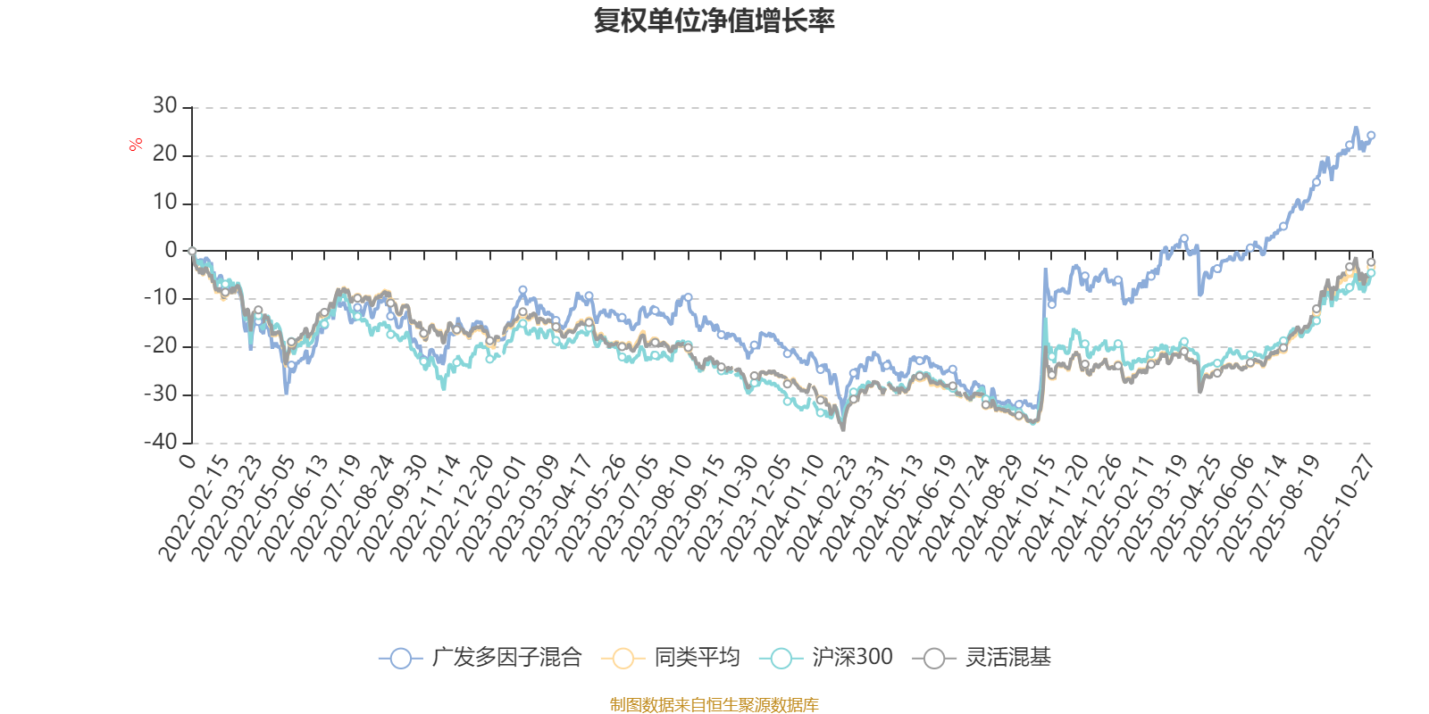 截至10月27日,广发多因子混合近三个月复权单位净值增长率为13.72%,位于同类可比基金575/1287;近半年复权单位净值增长率为28.83%,位于同类可比基金510/1287;近一年复权单位净值增长率为34.68%,位于同类可比基金346/1287;近三年复权单位净值增长率为58.19%,位于同类可比基金100/1286。
