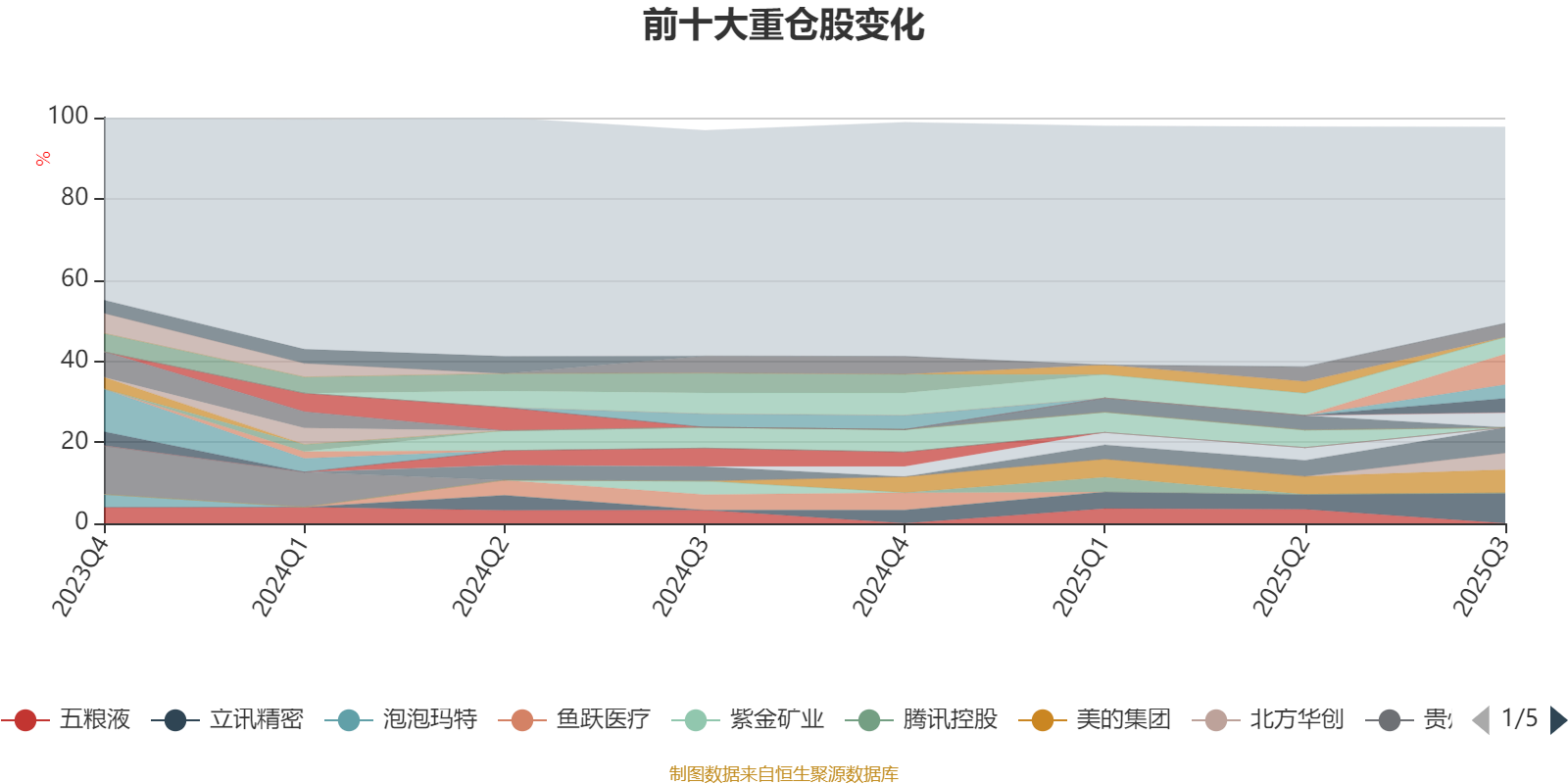 截至2025年三季度末,基金十大重仓股分别是阿里巴巴-W、立讯精密、中金黄金、美的集团、中通快递-W、北方华创、中芯国际、中金公司、川投能源、中国平安。