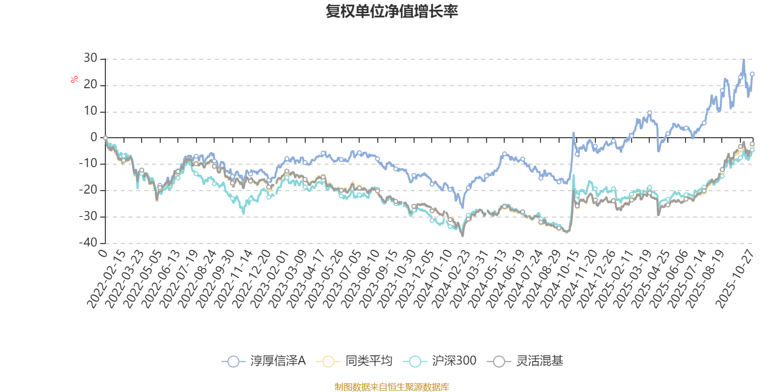 截至10月27日,淳厚信泽A近三个月复权单位净值增长率为11.03%,位于同类可比基金698/1287;近半年复权单位净值增长率为22.25%,位于同类可比基金693/1287;近一年复权单位净值增长率为28.80%,位于同类可比基金477/1287;近三年复权单位净值增长率为47.30%,位于同类可比基金157/1286。