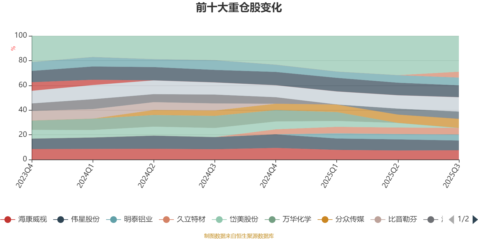 该基金持股集中度较高,近2年前十大重仓股集中度长期超过60%。截至2025年三季度末,基金十大重仓股分别是紫金矿业、美的集团、伟星股份、海康威视、分众传媒、继峰股份、杰克科技、久立特材、明泰铝业、三一重能。