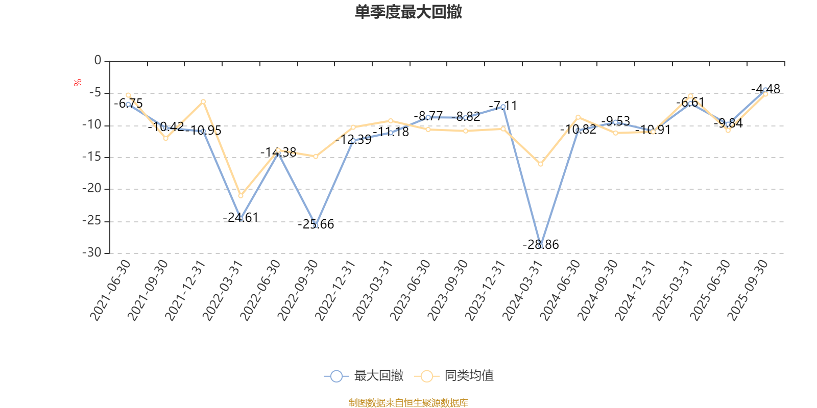 截至10月28日,基金近三年最大回撤为42.54%,同类可比基金排名143/177。单季度最大回撤出现在2024年一季度,为28.86%。
