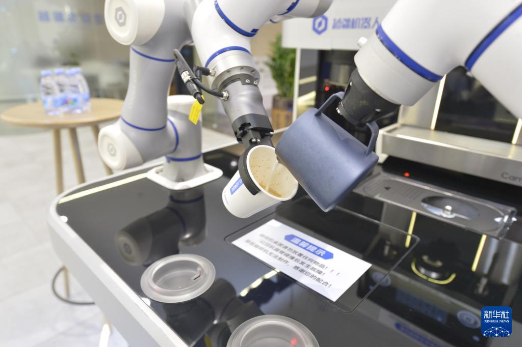 10月29日,在广东深圳越疆科技有限公司,机器人制作咖啡拉花。新华社记者刘力航摄