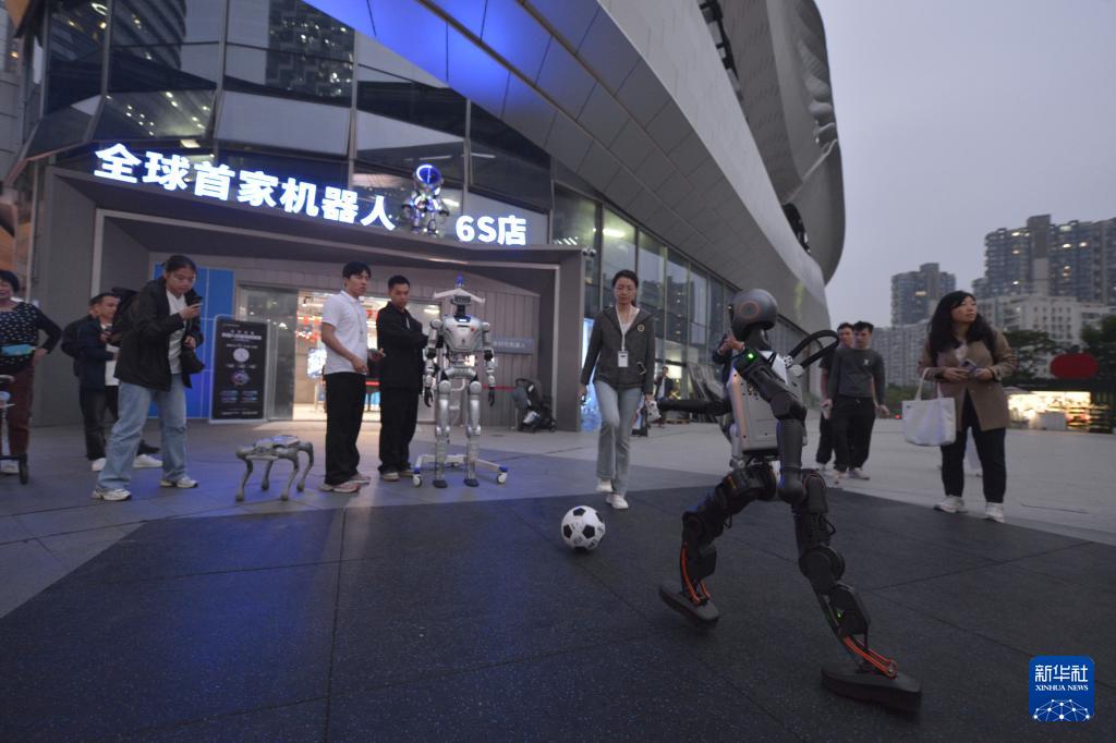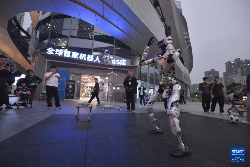10月28日,在位于广东深圳的机器人6S店门口,机器人在踢球。新华社记者刘力航摄
