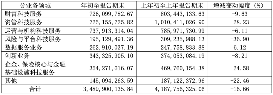 前三季度,营业收入下降主要系公司本期资管科技服务、风险与平台科技服务、企金、保险核心与金融基础设施科技服务收入比上年同期减少所致。净利润增长主要系公司本期投资收益比上年同期增加所致。