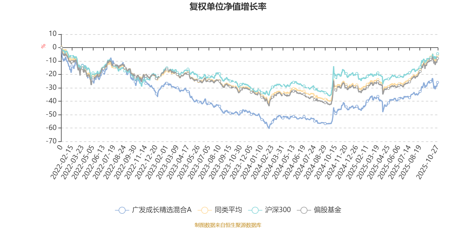 截至10月27日,广发成长精选混合A近三个月复权单位净值增长率为12.63%,位于同类可比基金82/130;近半年复权单位净值增长率为26.05%,位于同类可比基金75/130;近一年复权单位净值增长率为36.63%,位于同类可比基金45/130;近三年复权单位净值增长率为-2.58%,位于同类可比基金107/124。