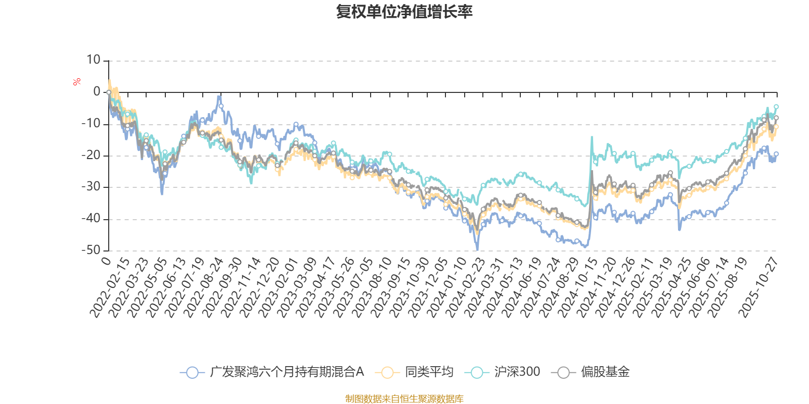 截至10月27日,广发聚鸿六个月持有期混合A近三个月复权单位净值增长率为17.37%,位于同类可比基金113/265;近半年复权单位净值增长率为32.57%,位于同类可比基金106/265;近一年复权单位净值增长率为27.94%,位于同类可比基金134/265;近三年复权单位净值增长率为-4.67%,位于同类可比基金222/253。