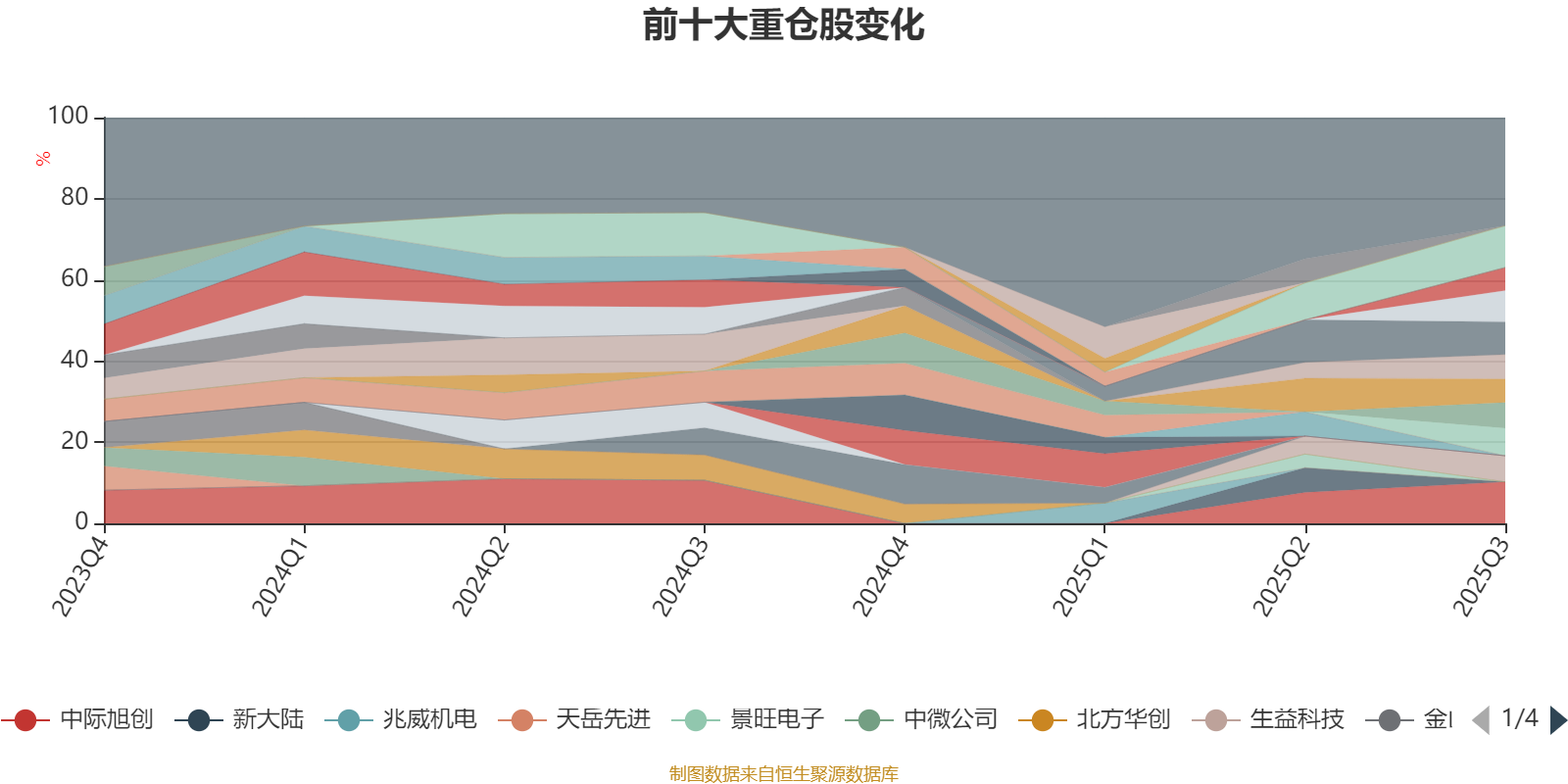 截至2025年三季度末,基金十大重仓股分别是新易盛、中际旭创、胜宏科技、工业富联、源杰科技、生益科技、英维克、沪电股份、生益电子、天孚通信。