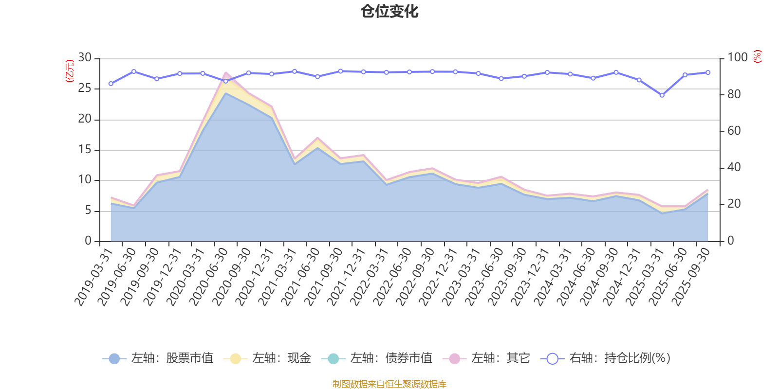 据定期报告数据统计,近三年平均股票仓位为90.02%,同类平均为86.77%。2021年三季度末基金达到93%的最高仓位,2025年一季度末最低,为79.88%。