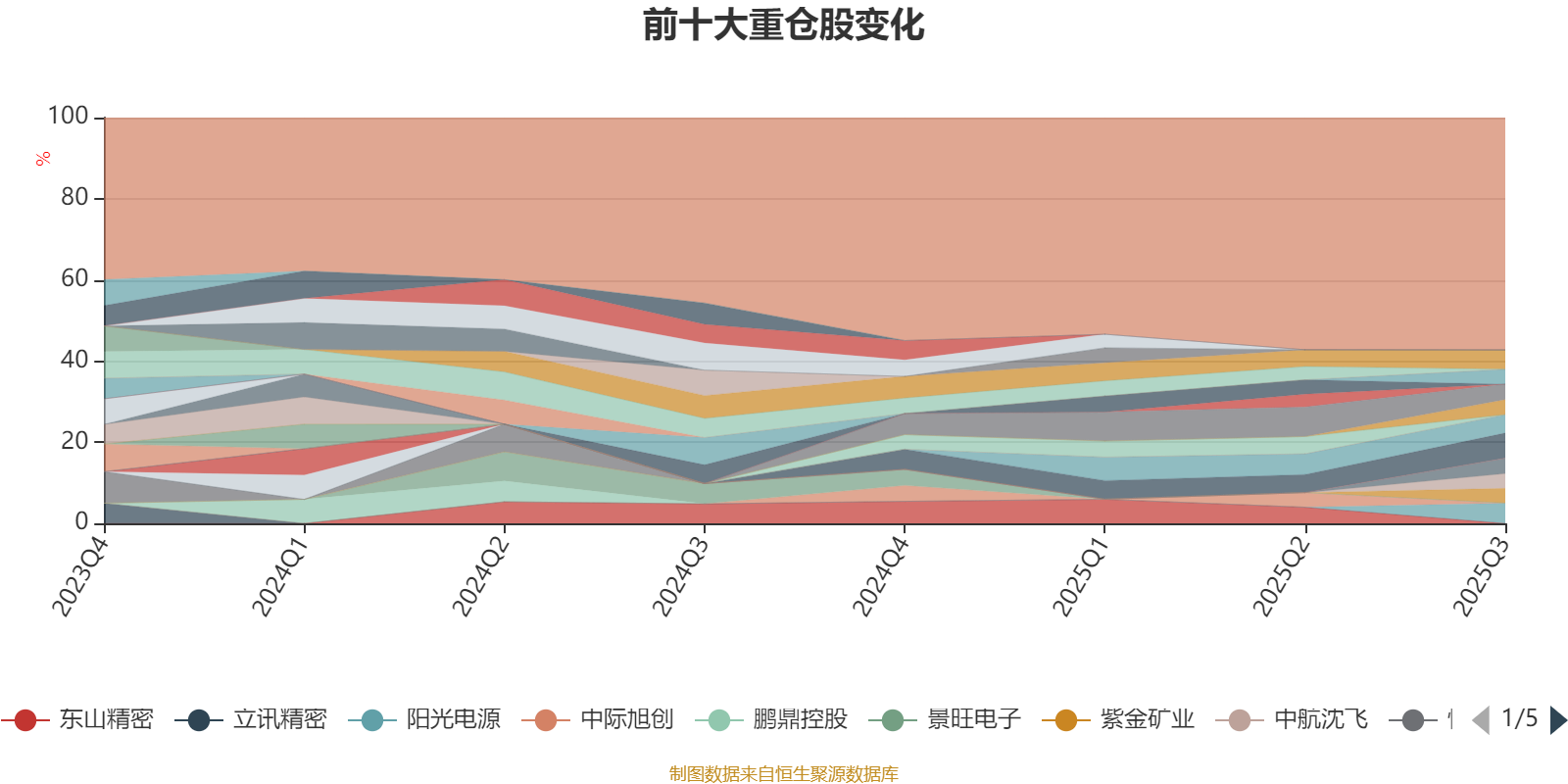 截至2025年三季度末,基金十大重仓股分别是宁德时代、阳光电源、长电科技、芯原股份、澜起科技、北方华创、海力风电、中科曙光、中航沈飞、紫金矿业。