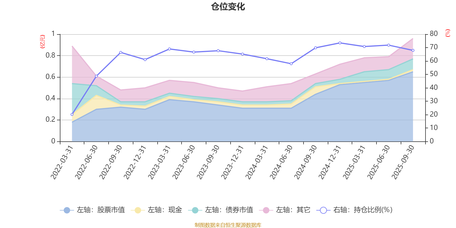据定期报告数据统计,近三年平均股票仓位为66.94%,同类平均为86.77%。2024年末基金达到73.51%的最高仓位,2022年一季度末最低,为20.17%。