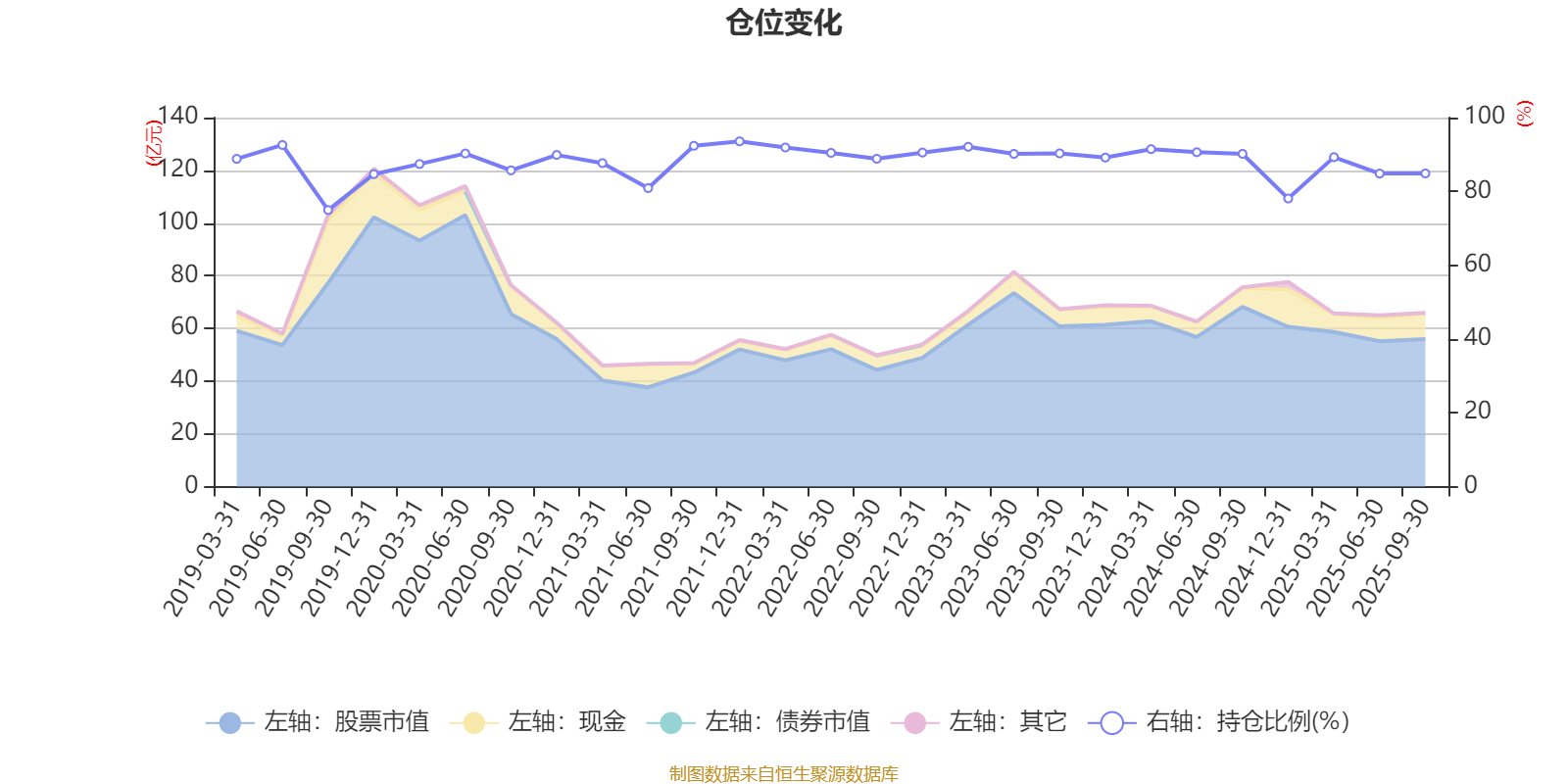 据定期报告数据统计,近三年平均股票仓位为88.46%,同类平均为67.37%。2021年末基金达到93.57%的最高仓位,2019年三季度末最低,为74.95%。