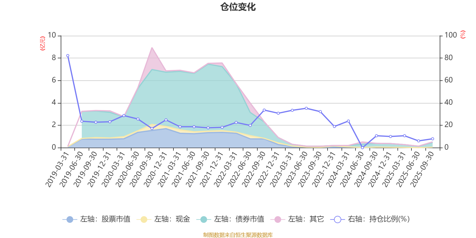 据定期报告数据统计,近三年平均股票仓位为18.31%,同类平均为72.35%。2019年一季度末基金达到82.25%的最高仓位,2025年上半年末最低,为6.1%。
