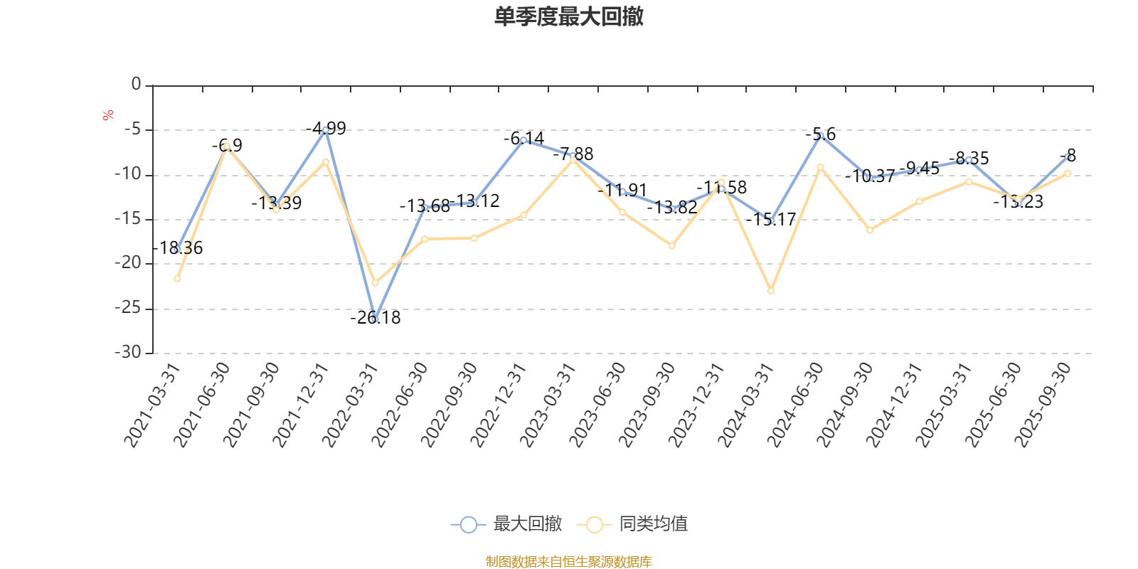 截至10月27日,基金近三年最大回撤为34.85%,同类可比基金排名25/159。单季度最大回撤出现在2022年一季度,为26.18%。