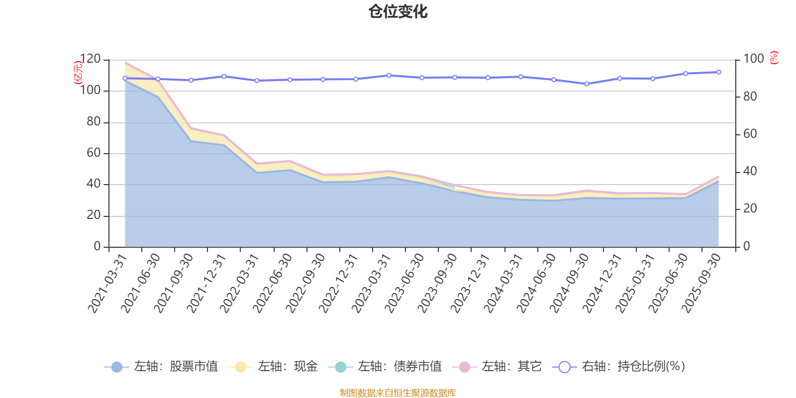 据定期报告数据统计,近三年平均股票仓位为90.49%,同类平均为86.77%。2025年三季度末基金达到93.38%的最高仓位,2024年三季度末最低,为87.07%。